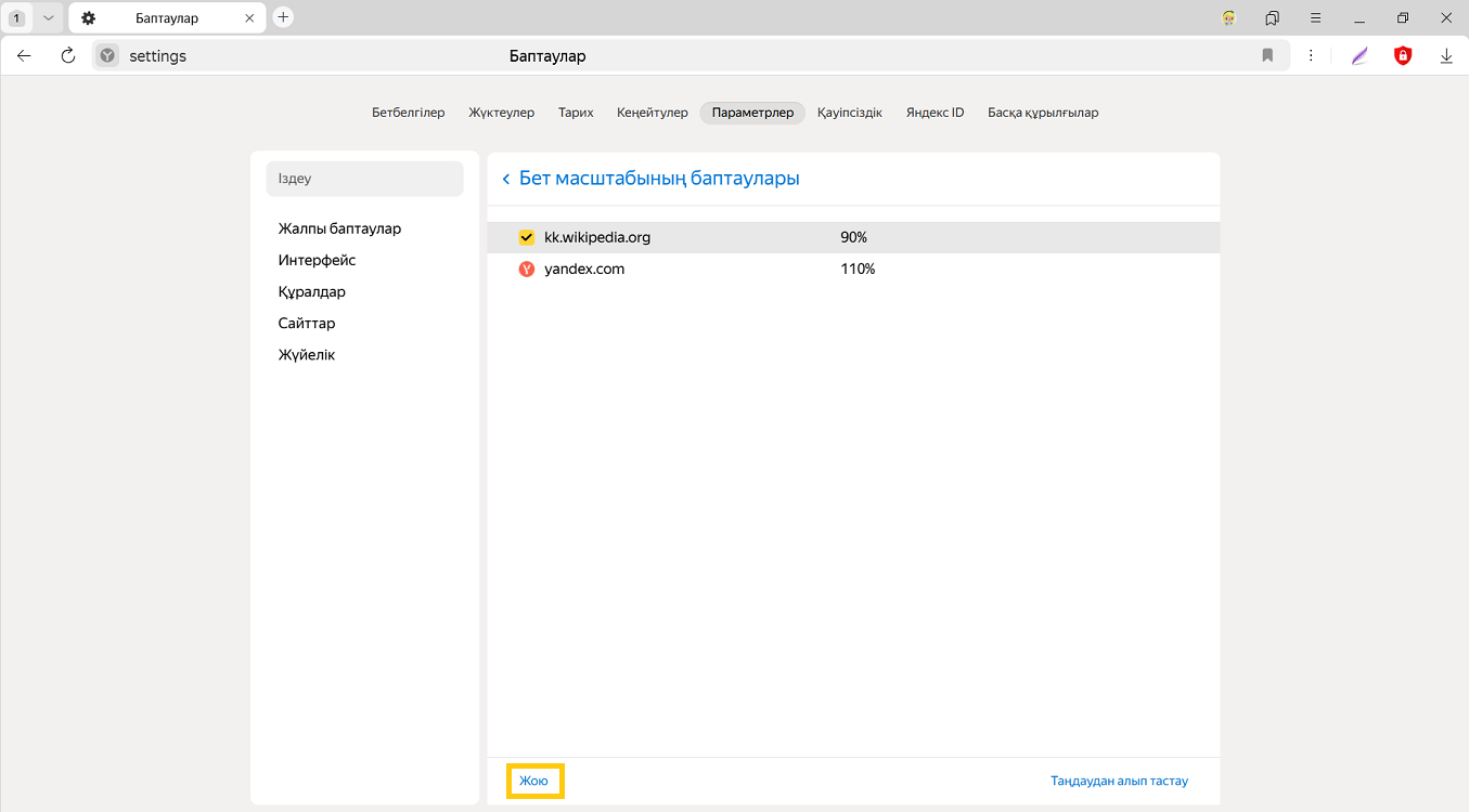 Өзгертілген масштаб туралы деректер Яндекс Браузерде сақталады. Қайта ашылған кезде, парақша таңдалған өлшемде көрсетіледі.