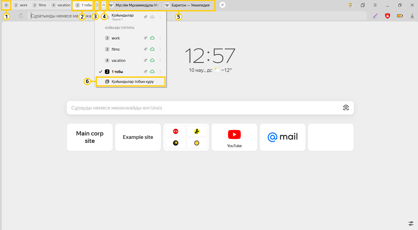 • Топ жасау — браузер терезесінің сол жақ жоғарғы бұрышындағы таңбасын басыңыз және Қойындылар тобын жасау тармағын таңдаңыз. Топтың атауын енгізіңіз. Жаңа қойындылар сонда ашылатын болады.