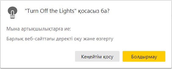Егер дереккөзге толық сенімді болсаңыз ғана, кеңейтімді қосыңыз. Бұл зиянды болуы мүмкін. Браузер зиянды кеңейтулерді бұғаттайды, бірақ егер әлі қара тізімге түспесе, деректеріңіз қатер астында болады. Толығырақ Зарарлы кеңейтімдер несімен қауіпті  бөлімін қараңыз.