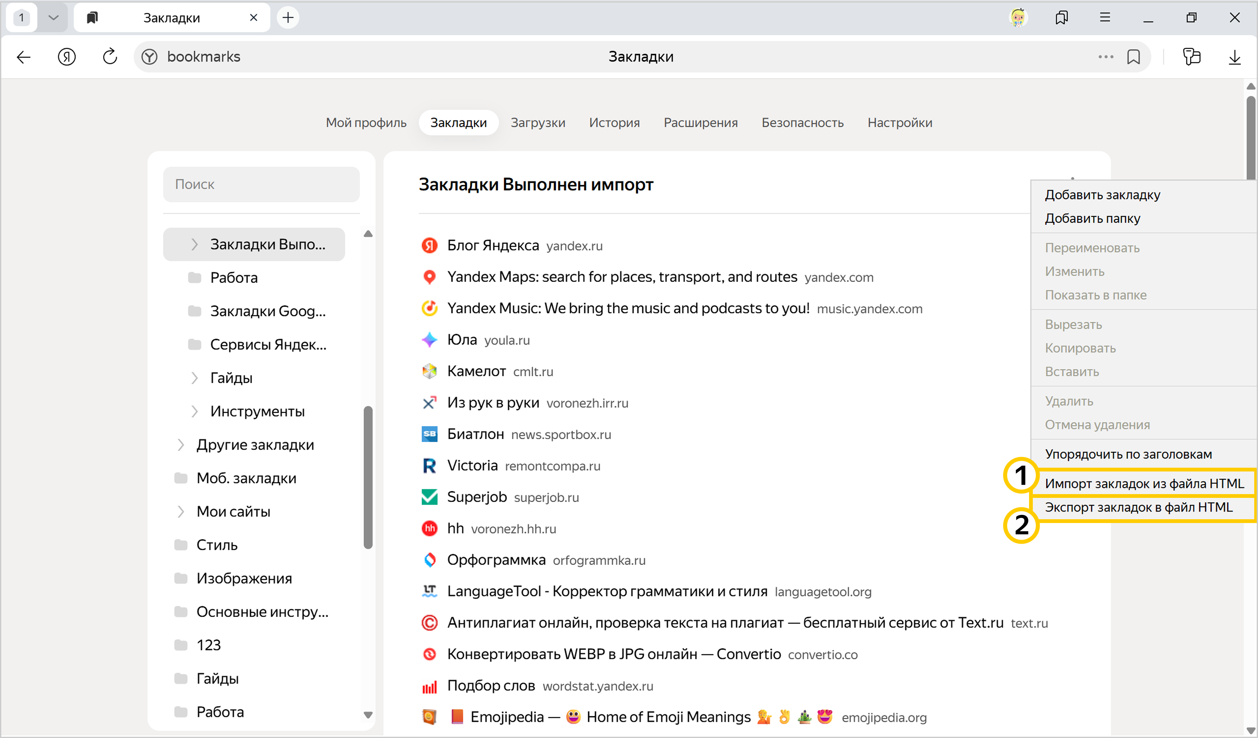 2. В строке Панель закладок справа нажмите  → Экспорт закладок в файл HTML.