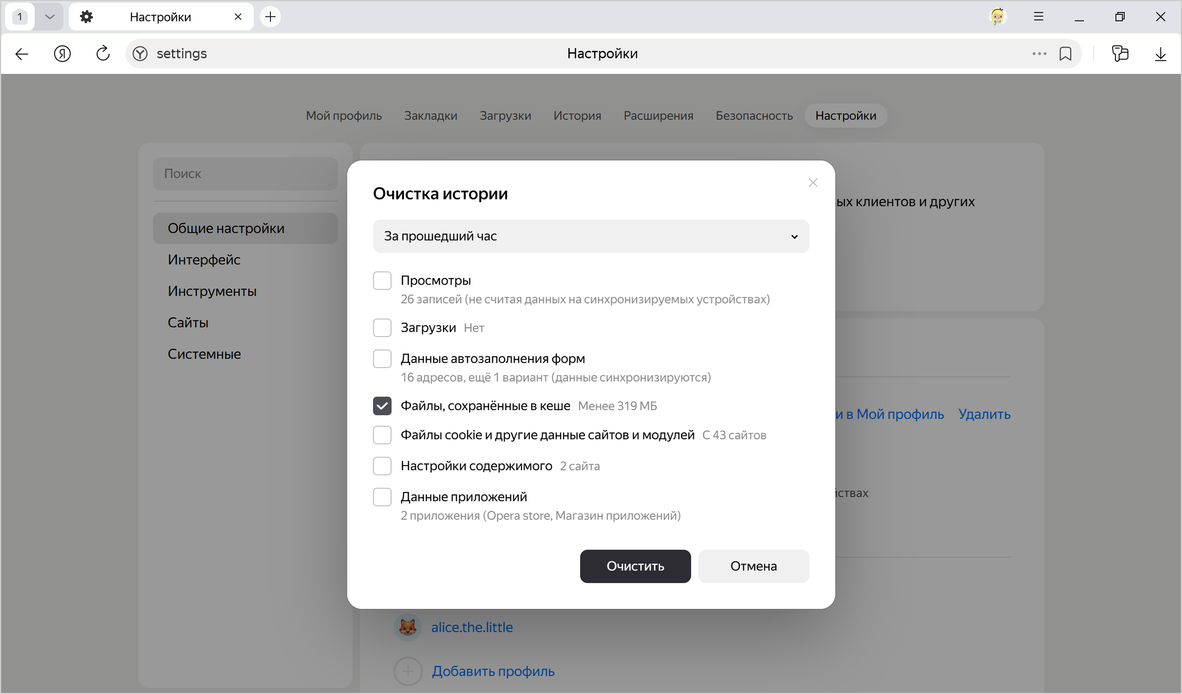 2. В списке Очистка истории выберите период для удаления кеша.