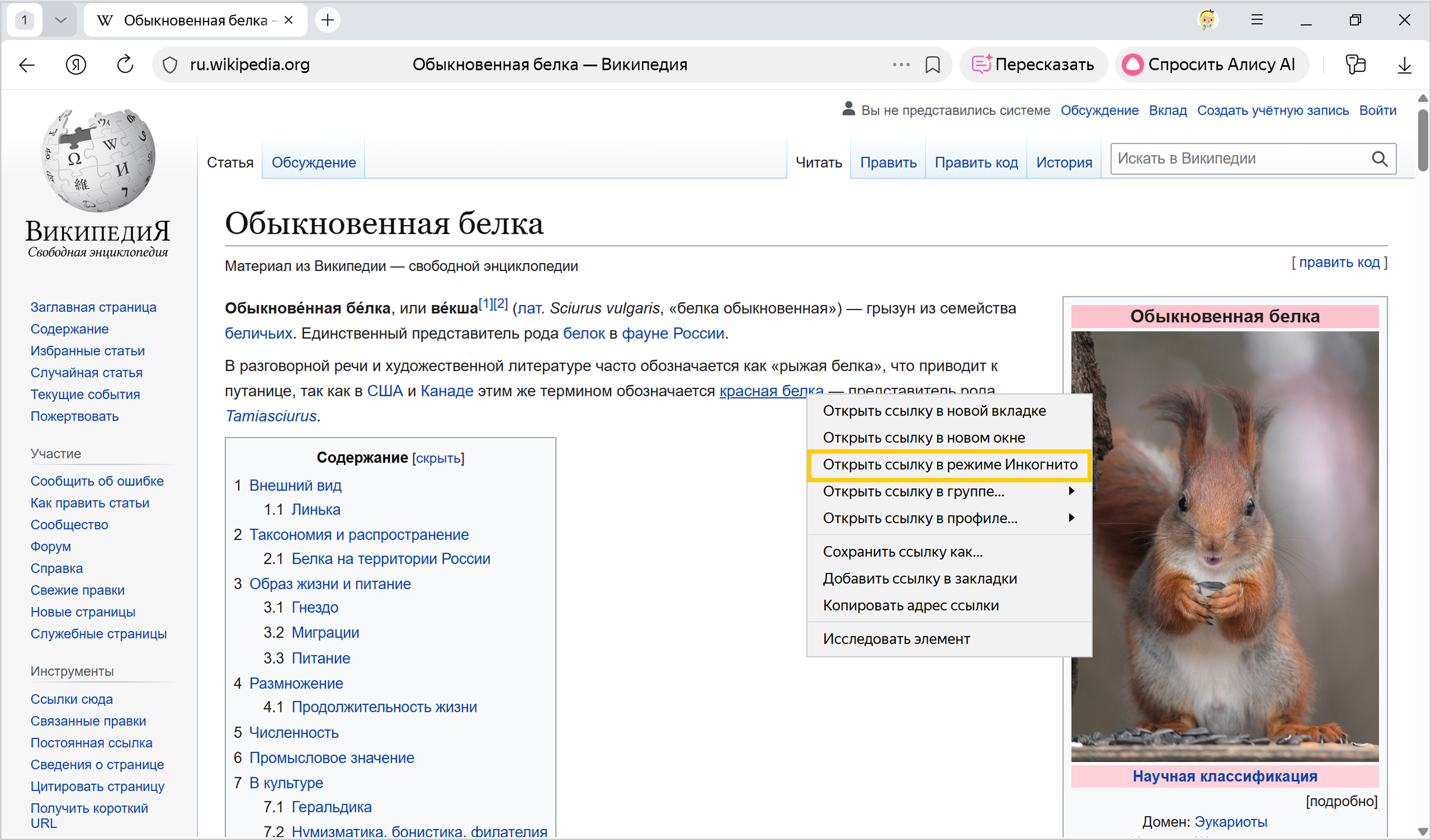• Нажмите ссылку правой кнопкой мыши и выберите Открыть ссылку в режиме Инкогнито.