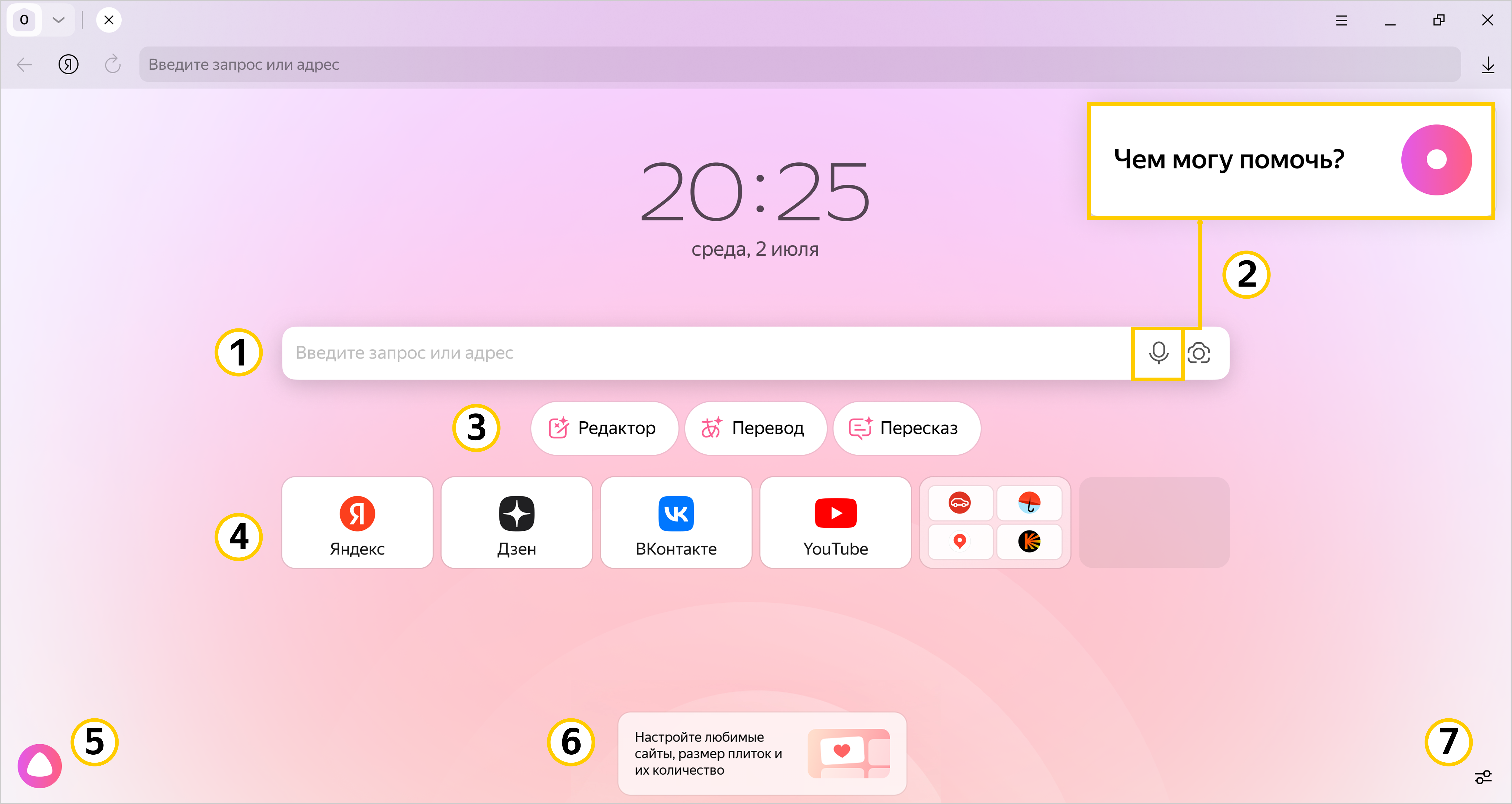 В правом нижнем углу экрана нажмите и выберите элементы, которые хотите видеть на новой вкладке: Часы и дата, Поисковая строка, Нейроинструменты и Подсказки по Браузеру.