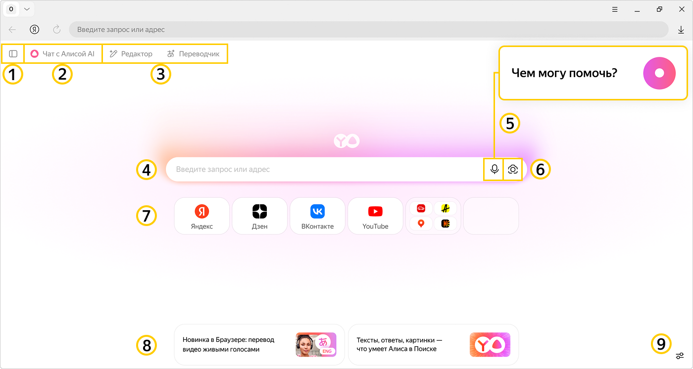 В правом нижнем углу экрана нажмите и выберите элементы, которые хотите видеть на новой вкладке: Поисковая строка, Нейроинструменты, Подсказки по Браузеру и Табло.