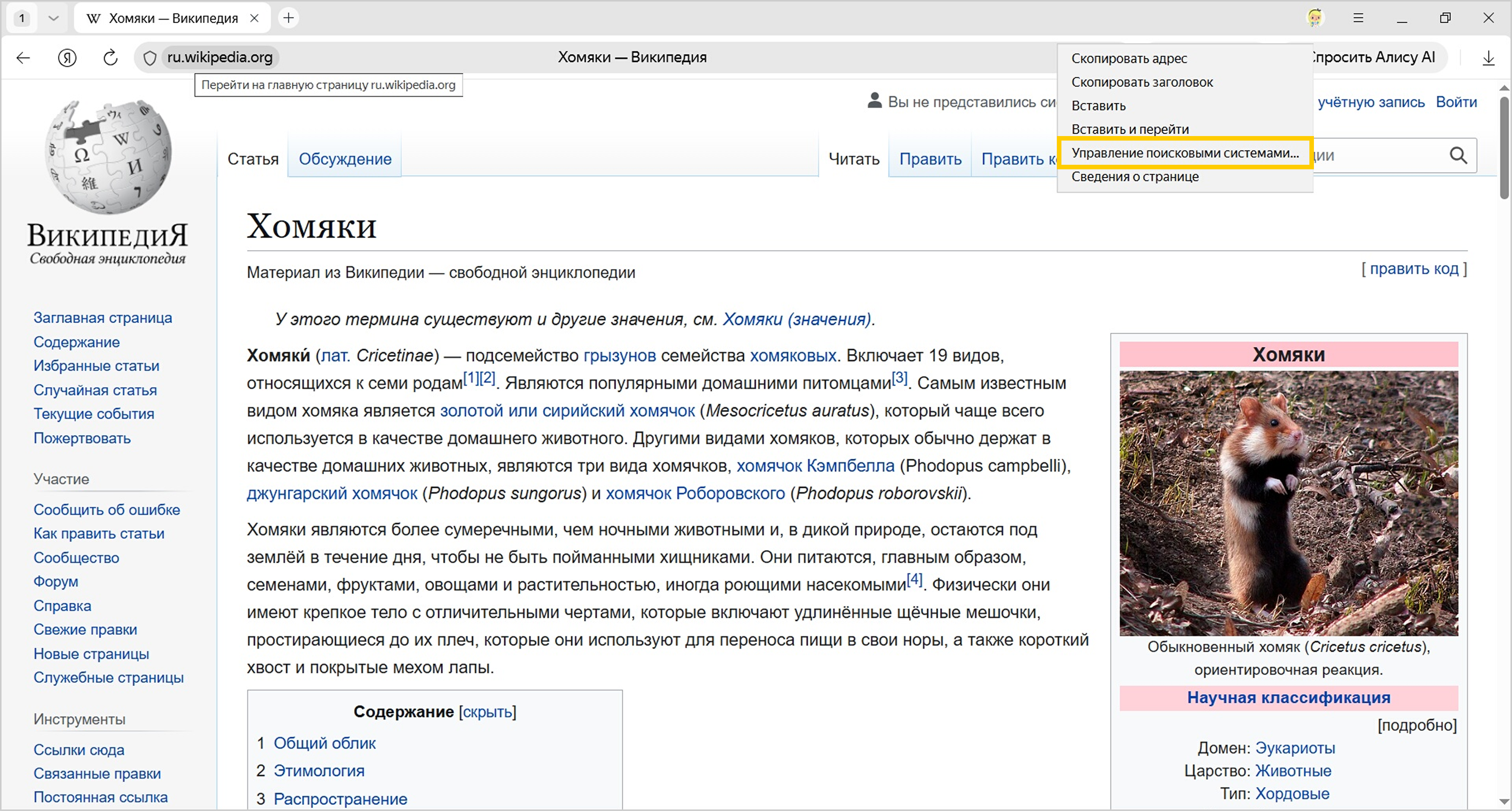 2. В контекстном меню выберите пункт Управление поисковыми системами...