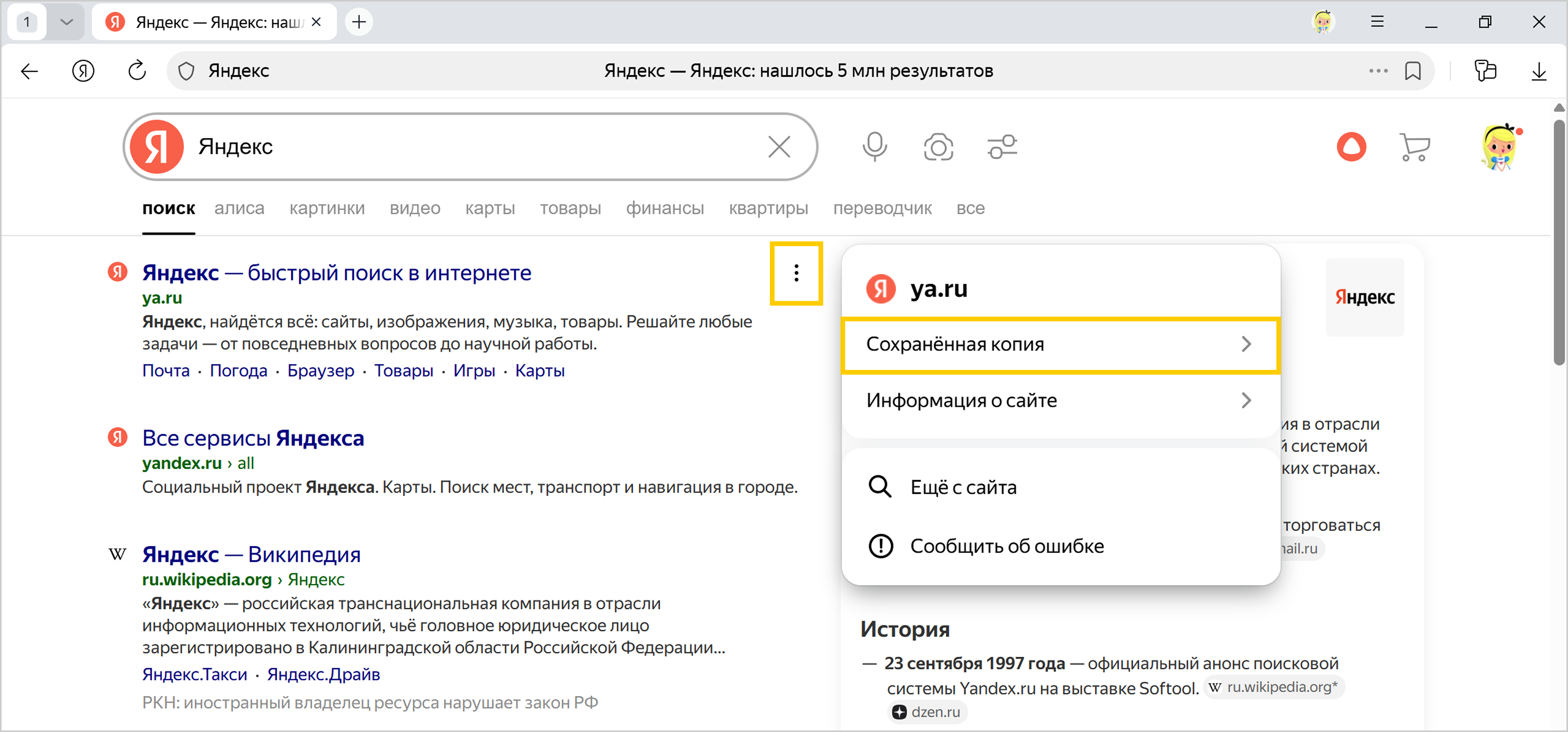 Чтобы увидеть ссылку на сохраненную копию, в поиске справа от названия сайта нажмите .