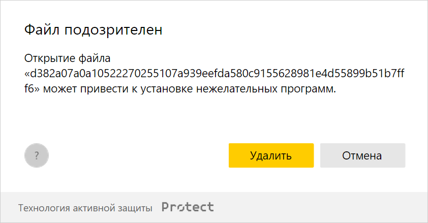 Яндекс Браузер блокирует загрузку вредоносного файла, но не является полноценным антивирусным продуктом. В то же время технология Protect защищает Браузер от компьютерных угроз, которые антивирусы не блокируют. Для полной защиты рекомендуем использовать и то и другое.