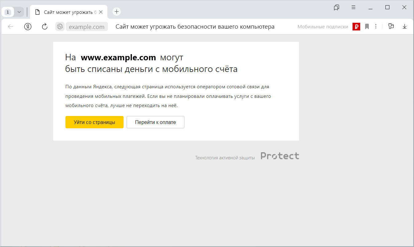Подписаться на платную услугу для своего телефона очень просто: достаточно нажать кнопку на странице сайта. В рамках комплексной системы защиты Protect Браузер предупреждает вас о платных подписках, чтобы вы соглашались на них только тогда, когда вам это действительно нужно.