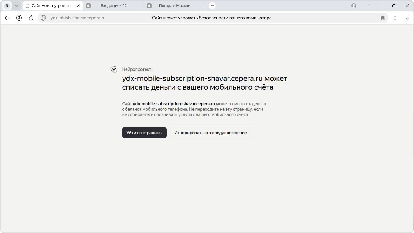 Если вы попадете на страницу сотового оператора с платной подпиской, Яндекс Браузер предупредит вас об этом — появится сообщение в окне Браузера. Нажимайте кнопку Игнорировать это предупреждение только в том случае, если вы планируете оплачивать подписку.