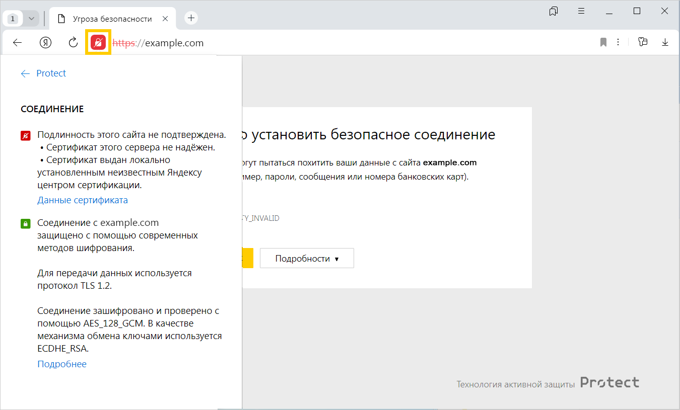 В рамках комплексной защиты Protect Браузер проверяет сертификаты сайтов. Если из-за проблем с сертификатом сайт не может обеспечить безопасное шифрование ваших данных, Яндекс Браузер предупреждает об этом.
