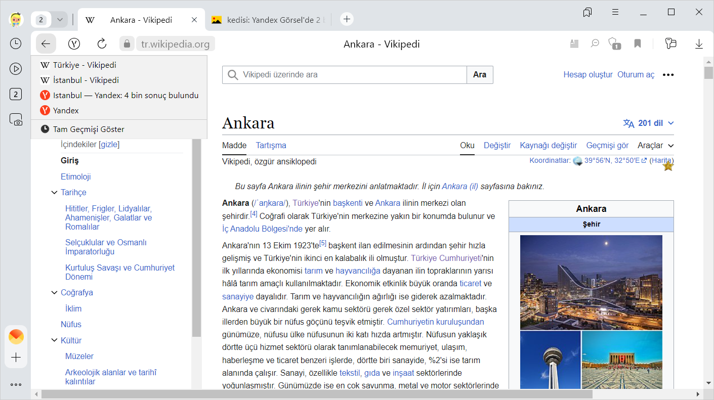 Bir sekmede daha önce açılmış sayfaların listesini görüntülemek için: