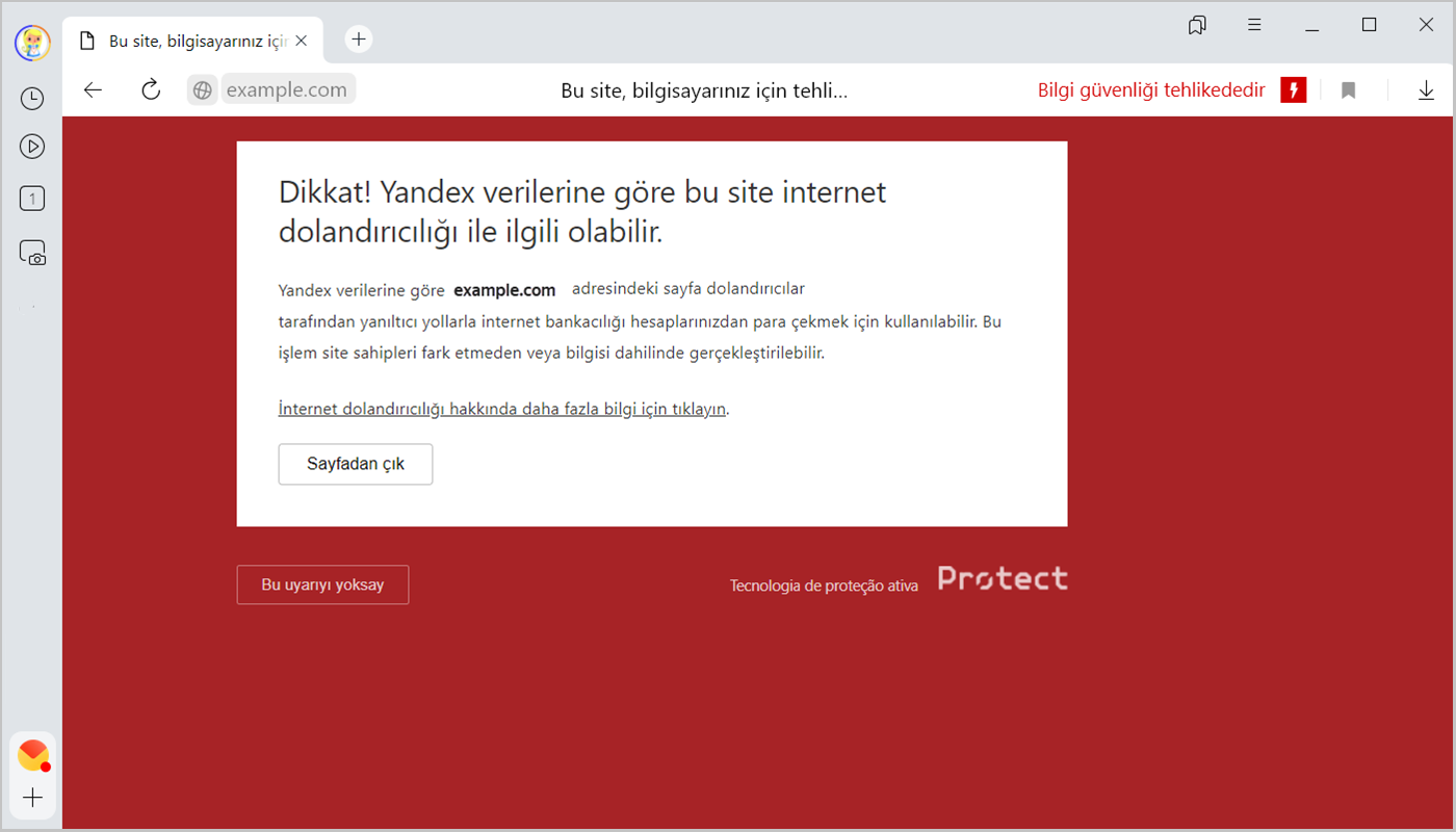 Yandex, phising amacıyla kullanılan siteler ile dolandırıcılar tarafından kullanılması muhtemel olan kaynakların izini sürer. Bu tür sitelerin adresleri özel bir veritabanında saklanır. Bu türden olması muhtemel bir siteye girmeyi denediğinizde Yandex Browser tehlikeli içeriği barındıran sayfayı engeller ve özel bir mesajın yanı sıra Akıllı Satır'da