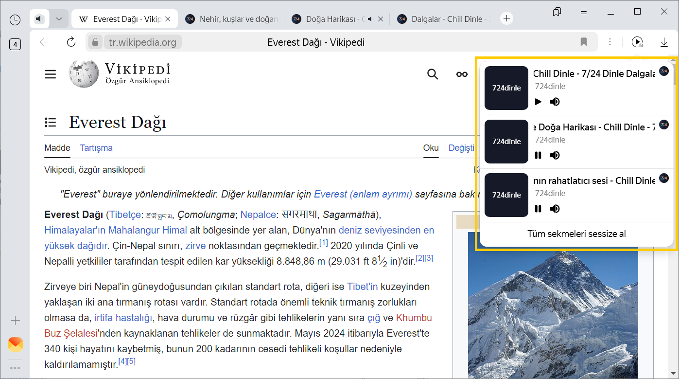 Birden fazla ses izi oynatıyorsanız ve bunları tek tek duraklatmak istemiyorsanız, Tüm sekmeleri sessize al butonuna tıklayabilirsiniz.