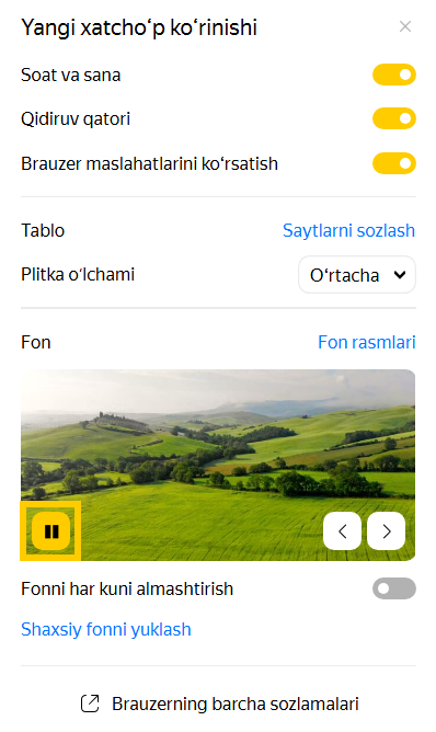 Animatsiya birlamchi ravishda yuqori aniqlik darajasida ijro etiladi. Agar bu Yandex Brauzer ishini sekinlatsa, standart sifatdagi animatsiyani o‘rnating: