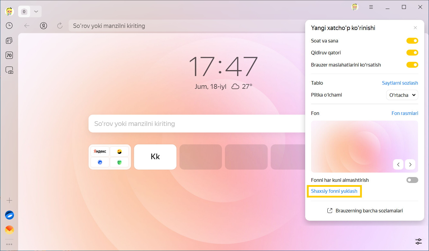2. Sahifaning pastki o‘ng burchagida  → Shaxsiy fonni yuklash tugmasini bosing.