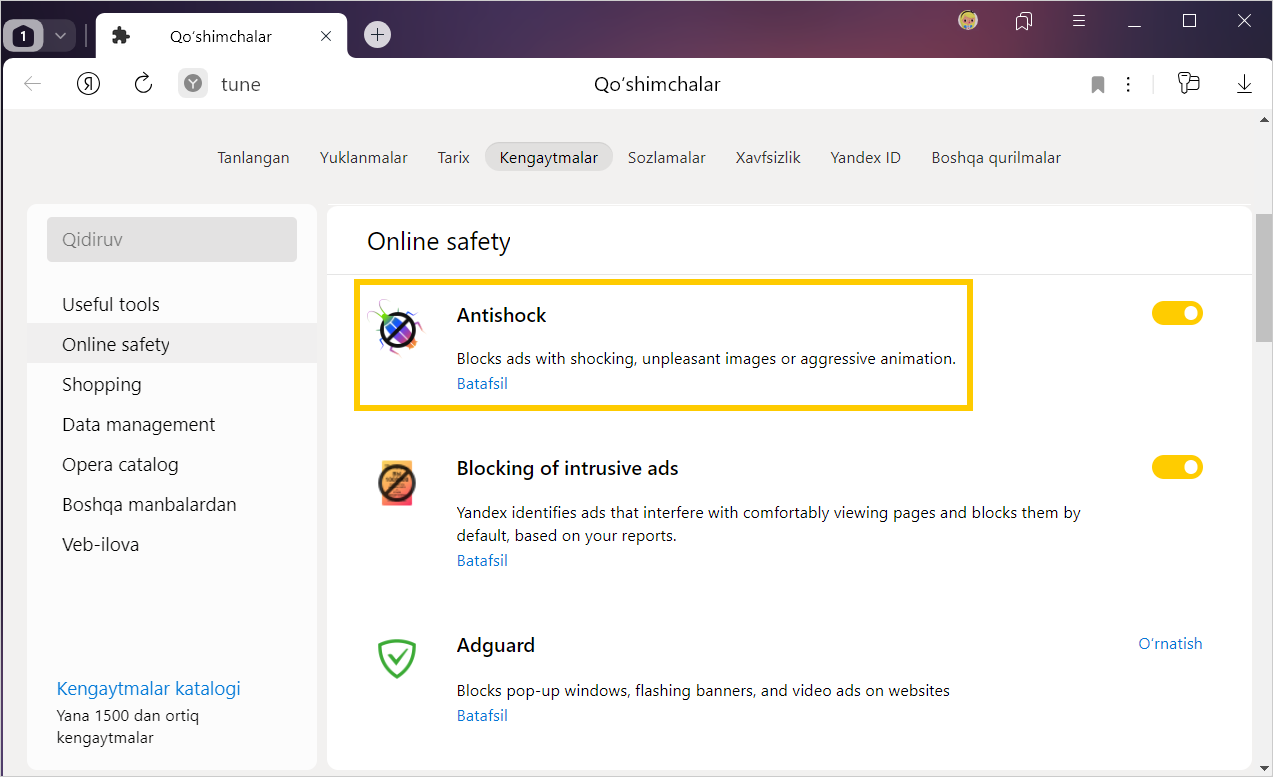 Antishok — Yandex Brauzerkengaytma bo‘lib, yoqimsiz tasvirlar, pornografiya yoki firibgarlar aldash maqsadida o‘z xizmatlarini taklif qilishi mumkin bo‘lgan veb-saytlar reklamasi aks etgan banner reklamalarini filtrlaydi.