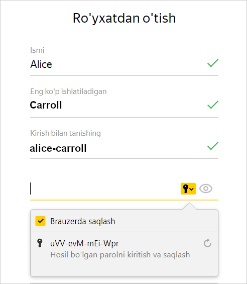 • Ro‘yxatdan o‘tish shakllarini avtomatik ravishda to‘ldirish — agar xususiyatni o‘chirib qo‘ysangiz, brauzer ro‘yxatdan o‘tish shakllariga login va parollarni kiritmaydi. Agar yoqilsa, Brauzerga login va parollarni yoki faqat loginlarni almashtirishga ruxsat berishingiz mumkin.
