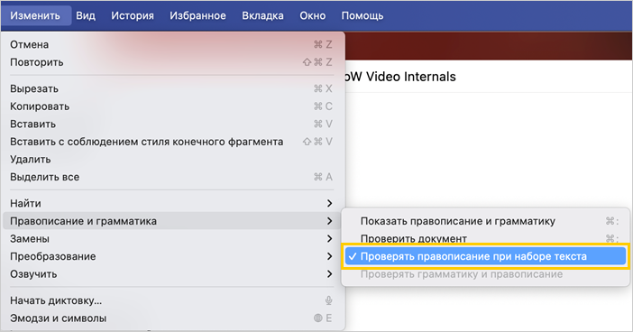 MacOS uchun brauzerda tizimning imlo tekshiruvi ishlatiladi.