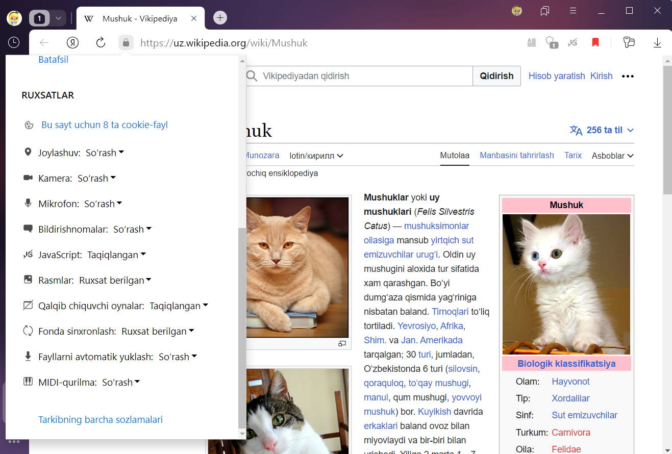 Ruxsat berish — saytga video-kameraga kirish imkoniyatni avtomatik ravishda olishga ruxsat berish. http-sayt uchun ushbu sozlama bir seans davomida amal qiladi va https veb-sayti keyingi tashrif paytida ham kameraga kira oladi.