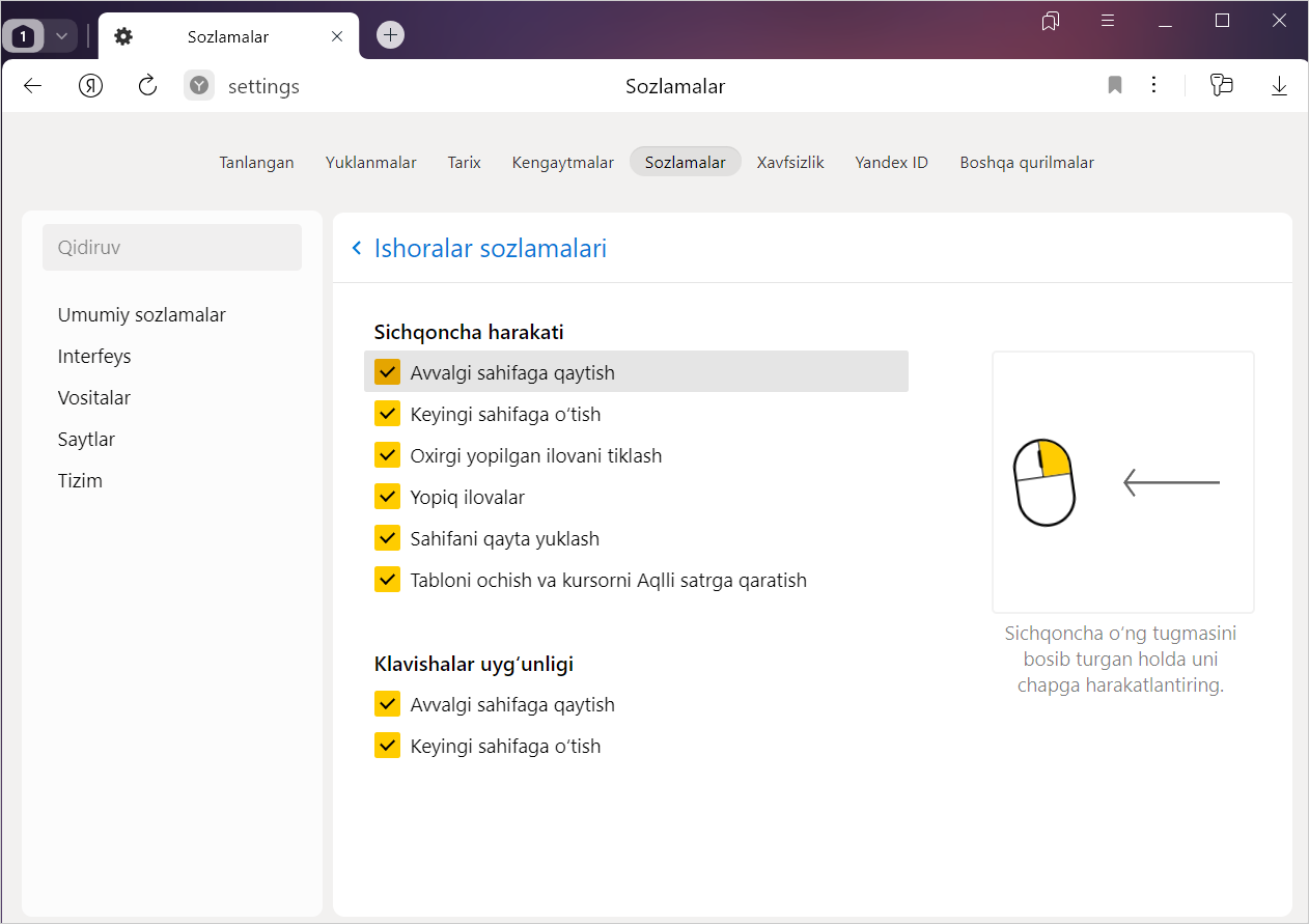 Birlamchi holatda Yandex Brauzer sozlamalarida sichqoncha ishoralarini qo‘llab-quvvatlash faolsizlantirilgan. Sichqoncha ishoralarini ishlatish uchun: