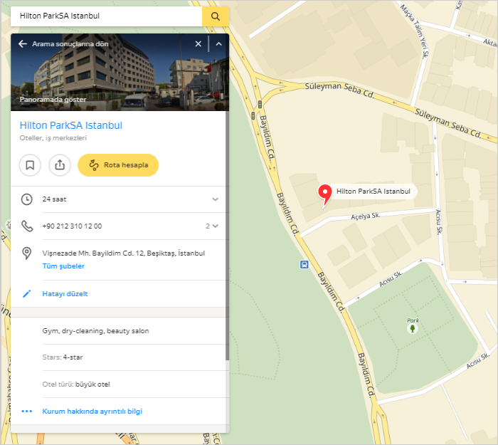 tıklayarak netleştirebilirsiniz. Sekmelerde adres, yorumlar, fotoğraflar, fiyatlar, haber içeren yayınlar gibi kurum hakkında tüm bilgiler yer alır.