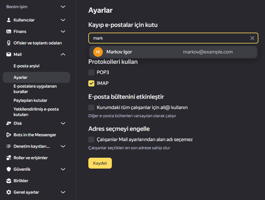 İlgili çalışanın adresini Kayıp e-postalar için posta kutusu alanına girin.