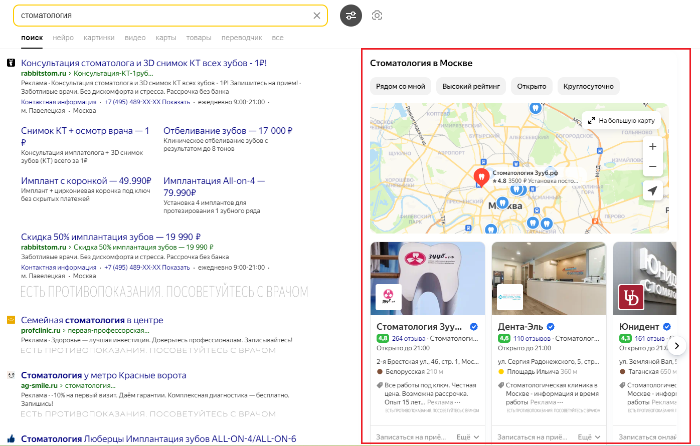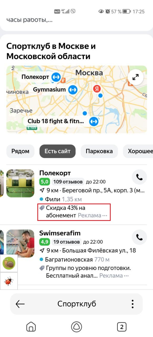 When users search for information about a location in Yandex Search, they see profiles of companies that match the query and operate in their region — they appear under the search bar or to the right of the search results. Your organization profile may be featured in special positions among similar companies. This way, users who are already looking for places to go to or services similar to yours are more likely to choose you, open your organization profile, call you, or visit right away.