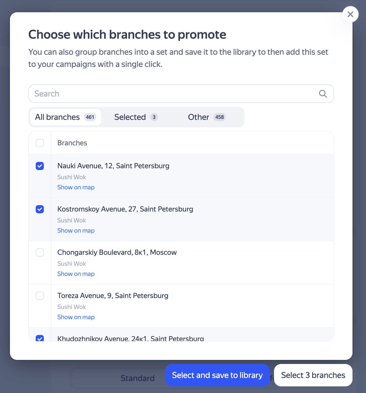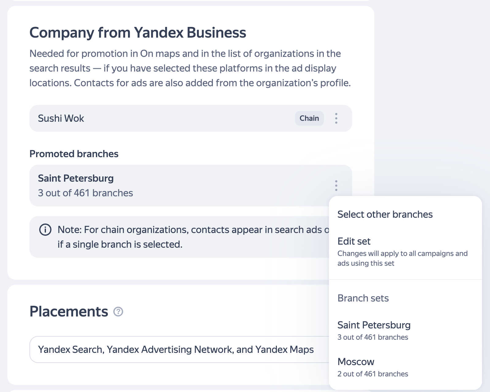 Regions selected in the campaign settings don't affect impressions in Yandex Maps or in the list of organizations in search results. For example, a user from Moscow is searching for an organization in Saint Petersburg. They may still see relevant profiles of organizations in the selected region. Other organizations may be displayed when changing the map scale.