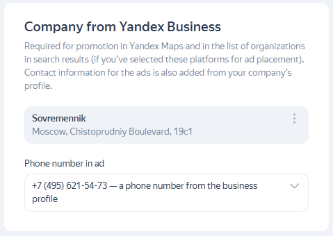 For your organization to appear in Yandex Maps, add it via the organization selection interface in your campaign or in your Yandex Business account.