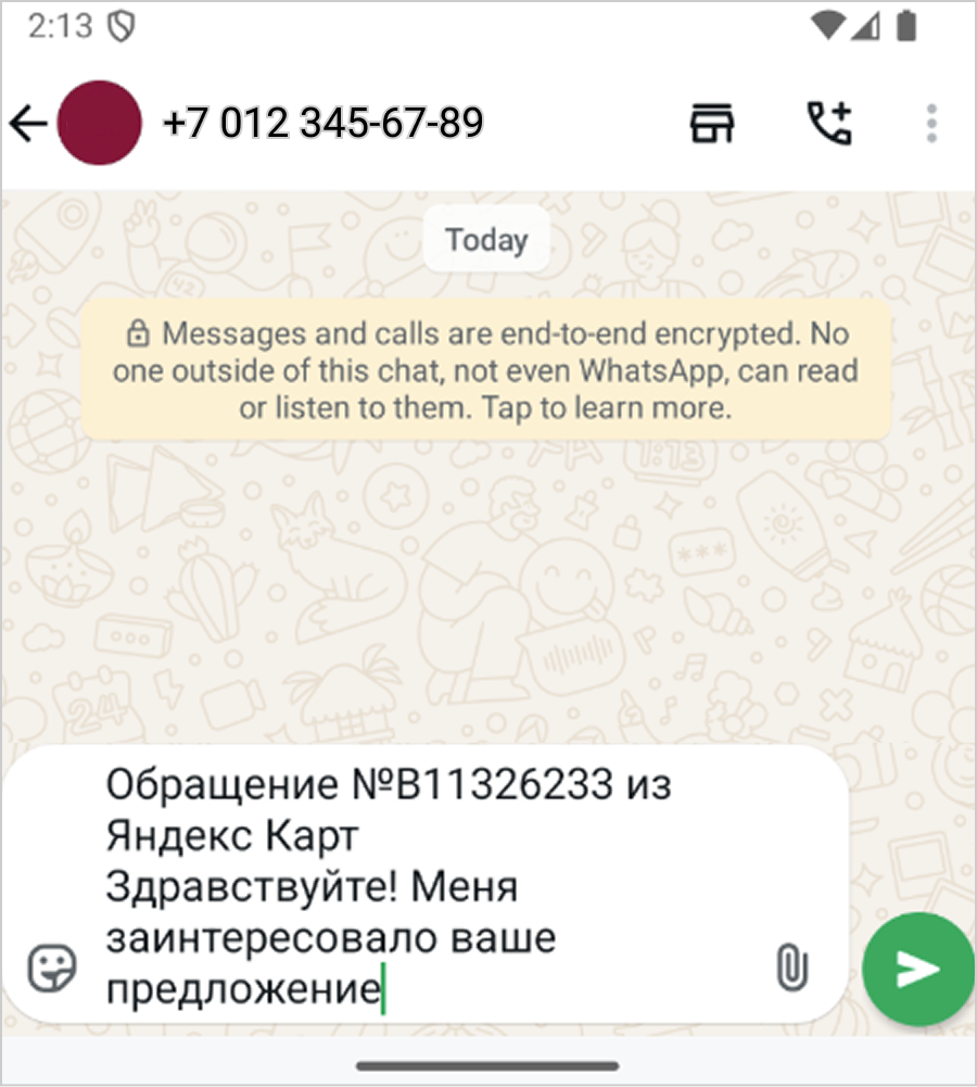 If you use a link to WhatsApp in Yandex Maps, a template with the following text will be added to the first message from the customer: “Request from Yandex Maps. Hello, I'm interested in your offer.”