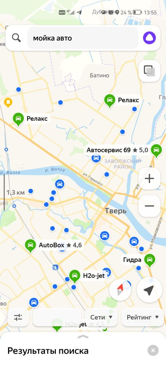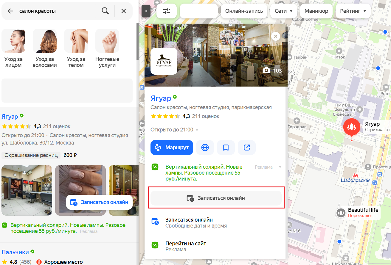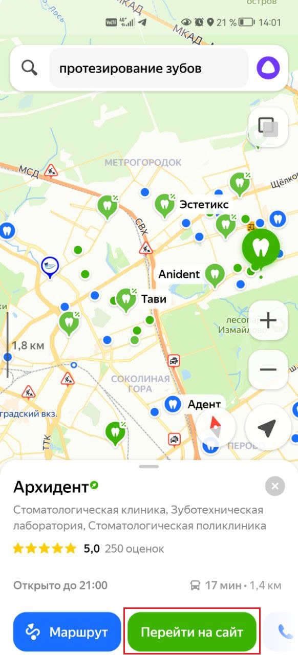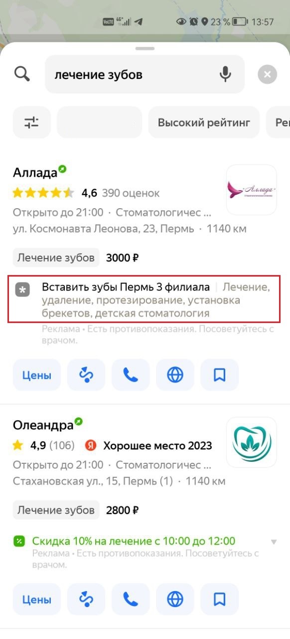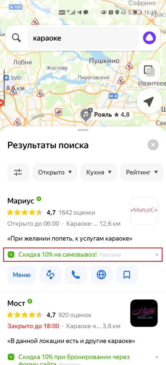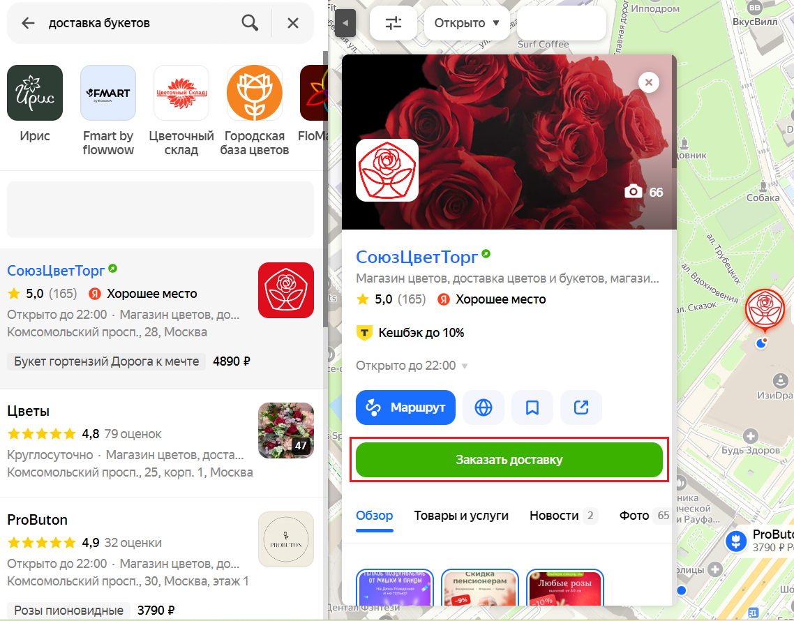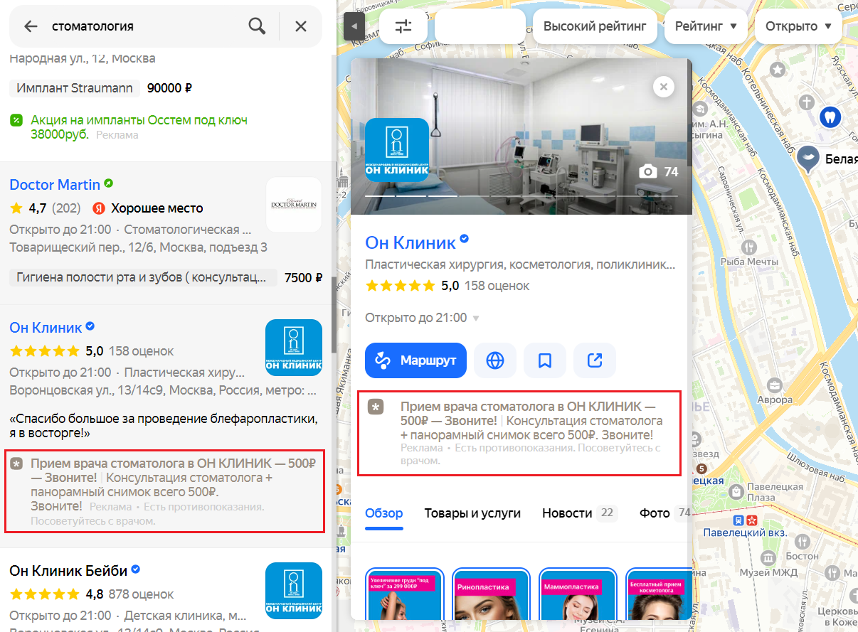 Company labels appear in Yandex Maps during searches. For organizations without promotions, the label is blue. Labels of companies promoted in Yandex Maps are shown in green when the ad wins the auction. Green labels are larger and brighter, making your organization stand out among others. Even when zoomed out, the green label remains visible, capturing user attention and helping potential customers remember its location.