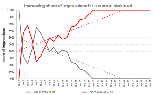 Here is an example of a change in the CTR and ad impression share for two ads in a group that were served in premium placement positions over a calendar month. The diagrams show that the more clickable ad is gradually displayed more often, contributing to the growth of the total group CTR.
