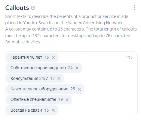 Yandex recommends that you keep callouts short and clear. Once created, you can add a callout to any ad in one or several campaigns.