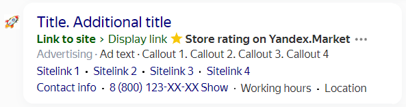 To make your ads more effective, we recommend that you fill out all the available fields when creating or editing your ad. In this case, the system will be able to create more options relevant for different users and situations. For example, you can add an image, a text, and sitelinks to suit people who prefer to reflect on ads before clicking them.
