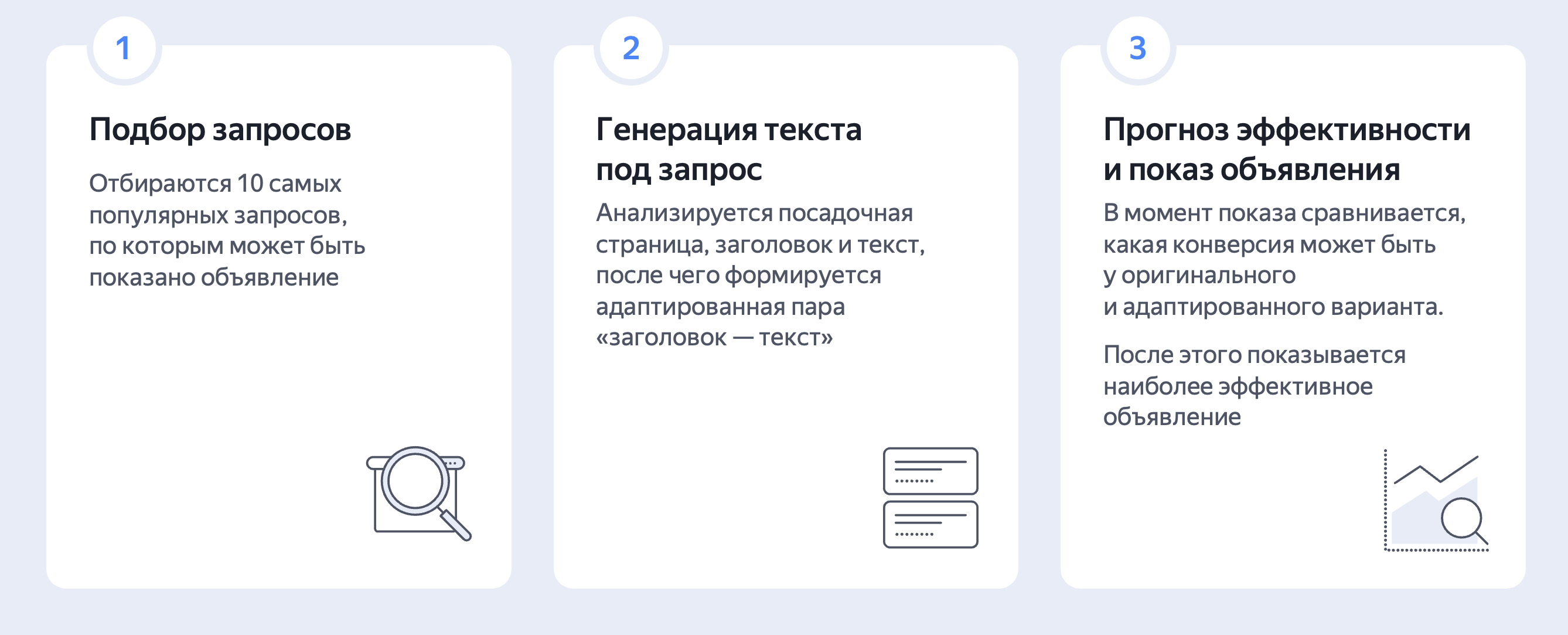 Additional options are created using Yandex Neuro Ads, a cutting-edge neural technology solution. The service selects up to 10 most popular queries that can return your ad. It then generates an alternative title and text pair for these queries. When serving the ad, the system predicts conversion chances for both the original and adapted versions and shows the most effective option to the user.