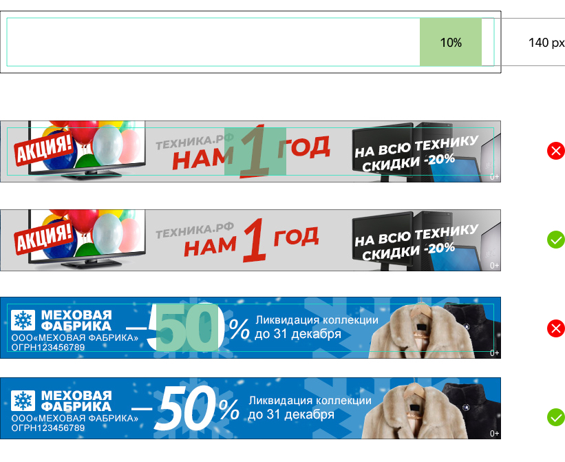 The margin between the edge of the banner and the text must be at least 20 pixels. Text and other banner elements can't overlap the safe areas.