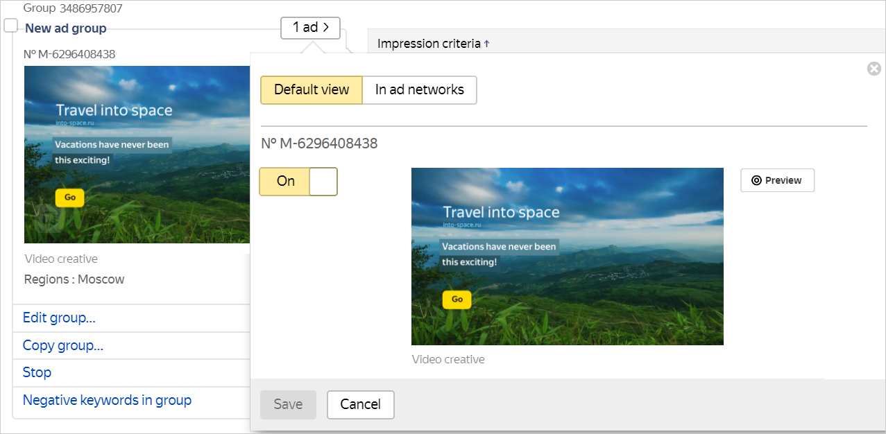 On your campaign page, find the group you need and click the button that displays the number of ads. In the view window, click
