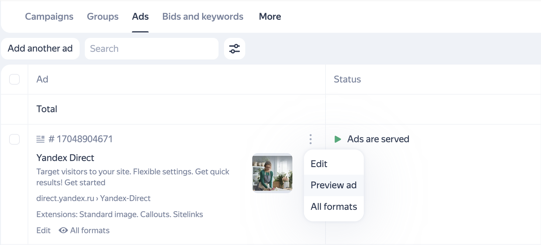 You can preview ads only in the Yandex Advertising Network, search results, and the product gallery. Preview is not available for other placements, including Telegram channels, dynamic placements in search results, promotion in Yandex Maps, the service gallery, and the list of organizations in search results.