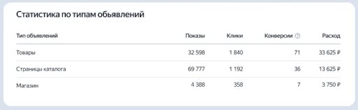 Displays impression, click, and conversion data for products, categories, and manufacturers. If you have E-commerce configured in Yandex Metrica, this section will provide additional data, such as the number of times a product was added to cart, the number of purchases, and the cost revenue ratio. This report helps you determine whether you need to make adjustments to the settings and structure of your campaign.