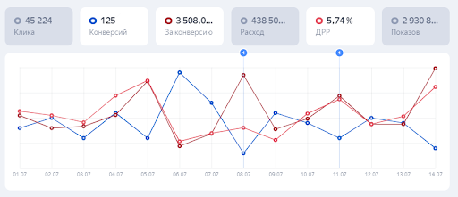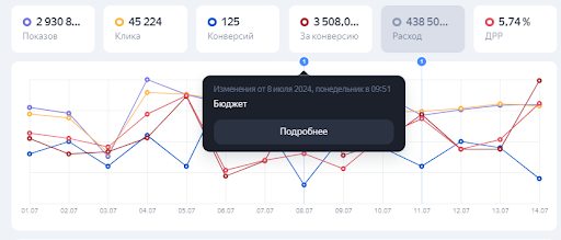 The chart shows how your metrics evolve over the course of your campaign and the effect of adjustments to its goal, budget, ads, and other parameters. Analyzing this chart can help you understand how various changes affected the campaign's results.