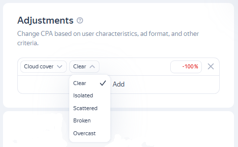 • To serve the banner in cloudy weather, set the Cloud cover parameter to “No” and specify the adjustment of −100%.