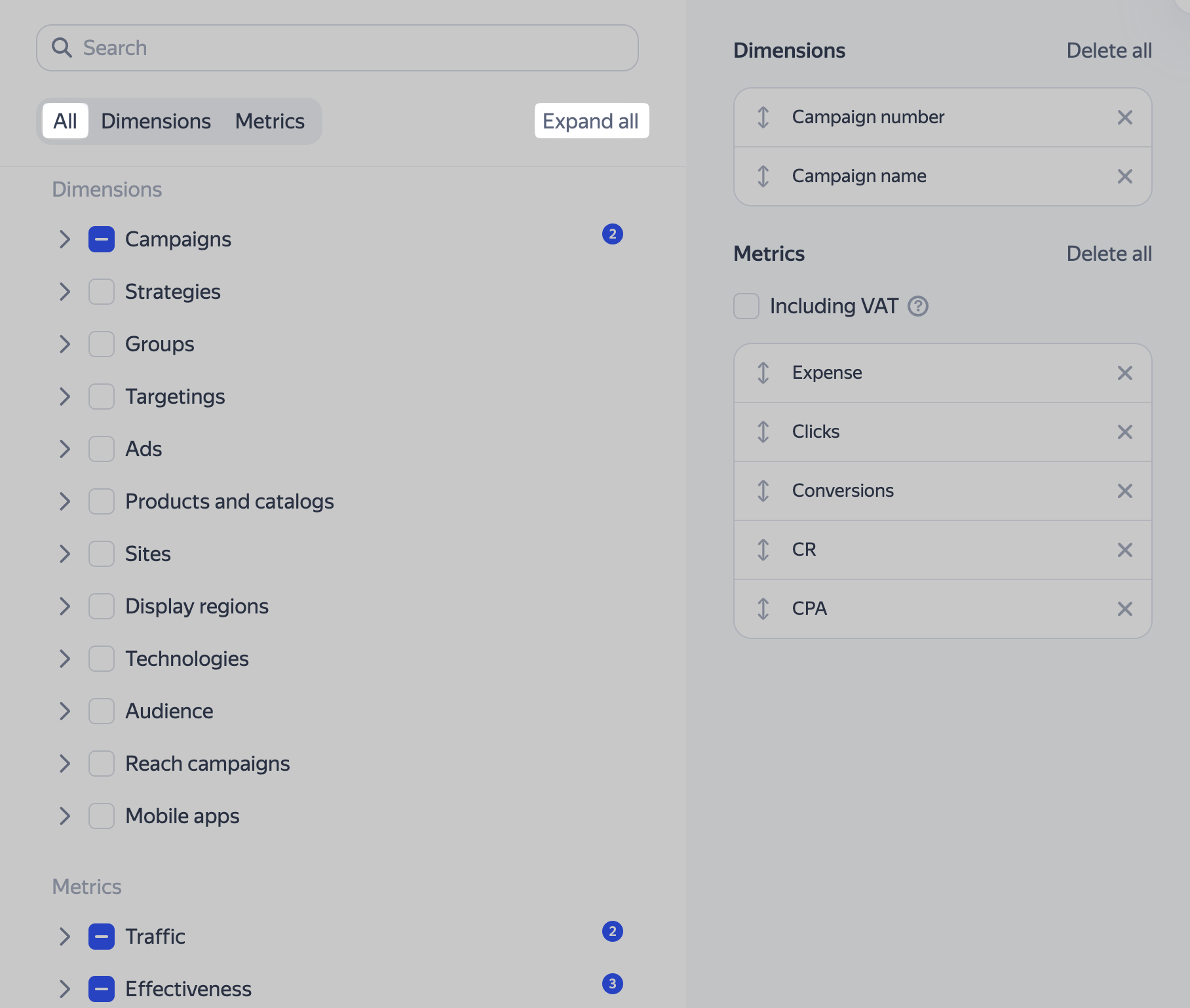 Metrics and dimensions are divided into semantic groups. You can search for them by name. All dimensions can be expanded.