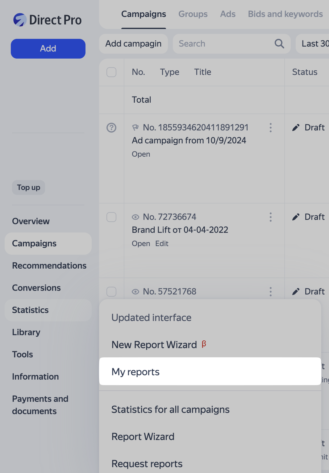 You can find it in the Yandex Direct Pro sidebar menu, under Statistics.