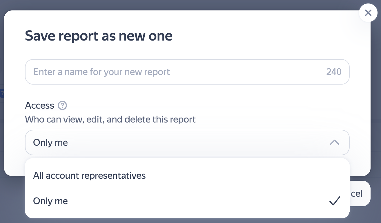To save your report, in the upper-right corner, click Save report → Save report as new one. When saving, you can select users who will have access to the report, such as only you or all account representatives.