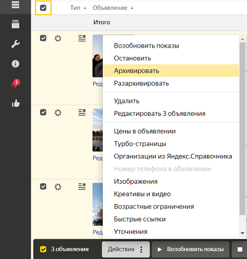 To perform an action **with individual ads in a group, **select several desired ads and click Actions.