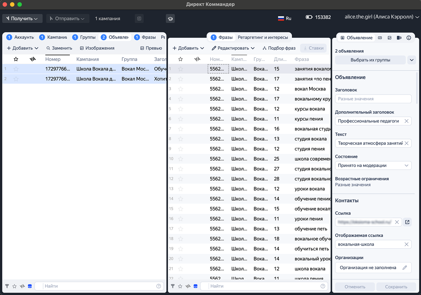 • копировать и перемещать кампании, группы, объявления и фразы;
