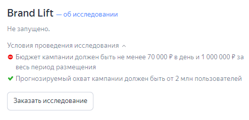 В параметрах кампании в блоке Brand Lift нажмите Заказать исследование.