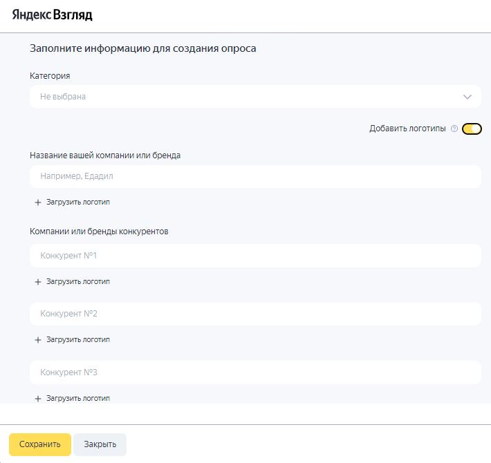 Заполните информацию о своем бренде и введите до 4 брендов конкурентов. Если вы выбрали дополнительный показатель Ad Message Recall, введите рекламные сообщения — свое и конкурентов. Опрос должен соответствовать требованиям.