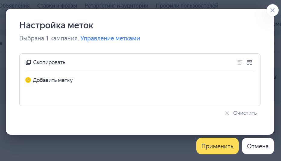 Метки позволяют объединять группы объявлений внутри кампании для быстрого поиска и редактирования. Вы можете посмотреть сразу все группы объявлений, которым присвоена одна и та же метка, и применить к ним общие действия.