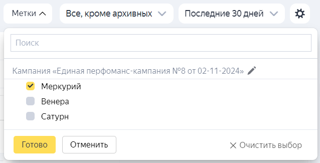 В Директе можно использовать уже созданные метки для фильтрации групп. Для этого выделите кампанию и перейдите к ее группам. Нажмите Метки и выберите одну или несколько меток из списка.